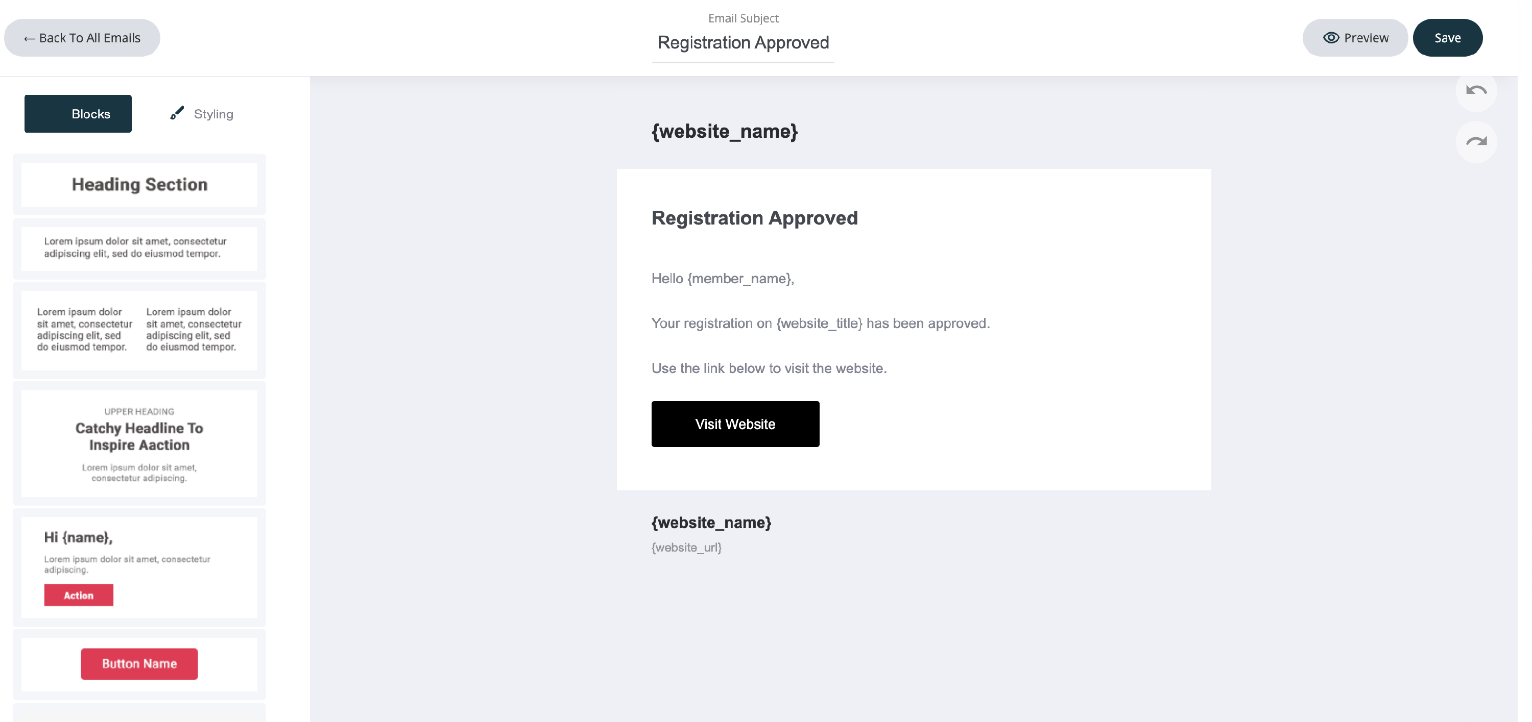 Just like any other email, you can edit the template with the drag and drop email editor. Below is the member registration approved system email. We have already added the system fields such as website name and specific fields that are allocated to this email. All of which can be edited or deleted.