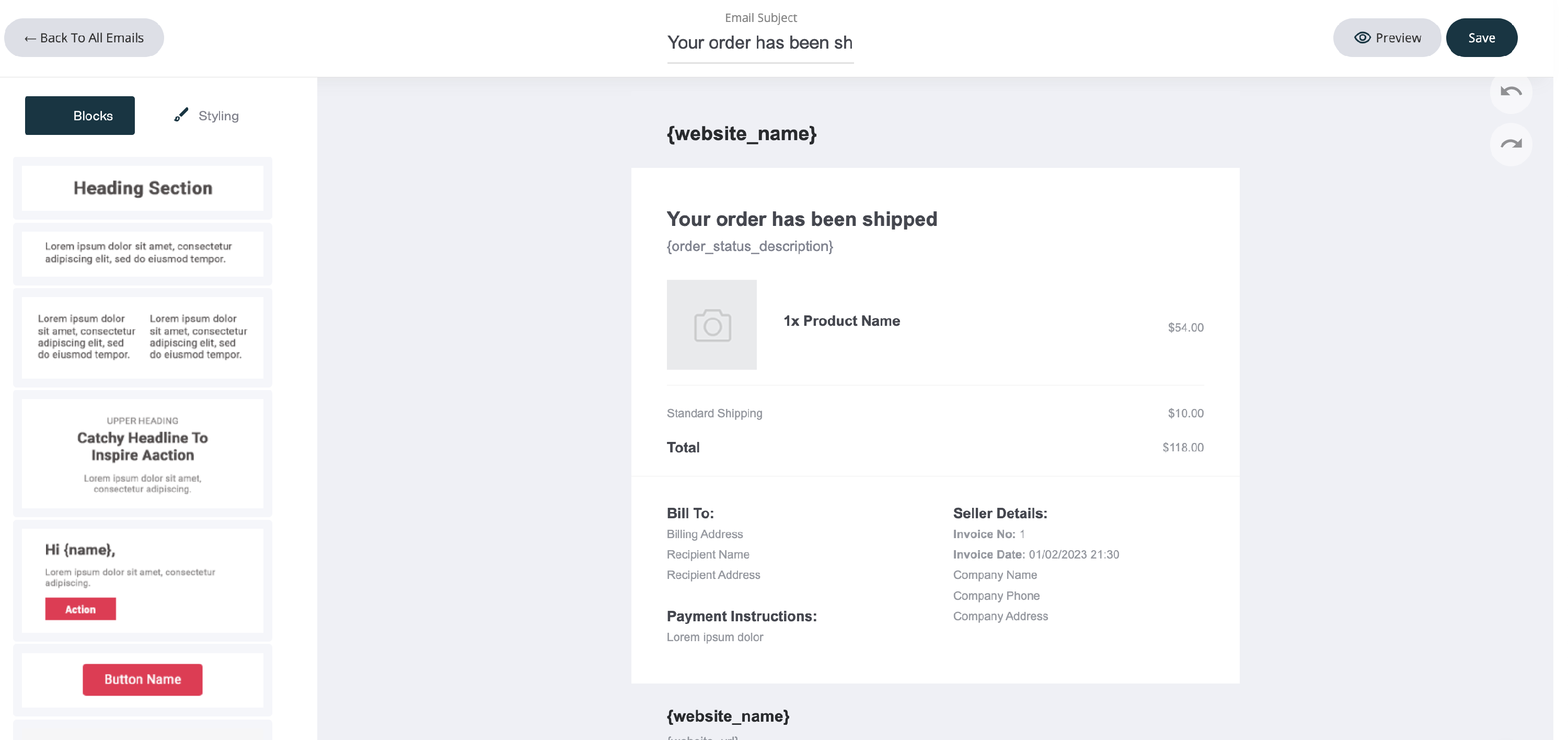 Just like any other email, you can edit the template with the drag and drop email editor. Below is the order shipped system email. We have already added the system fields such as website name and specific fields that are allocated to this email. All of which can be edited or deleted.
