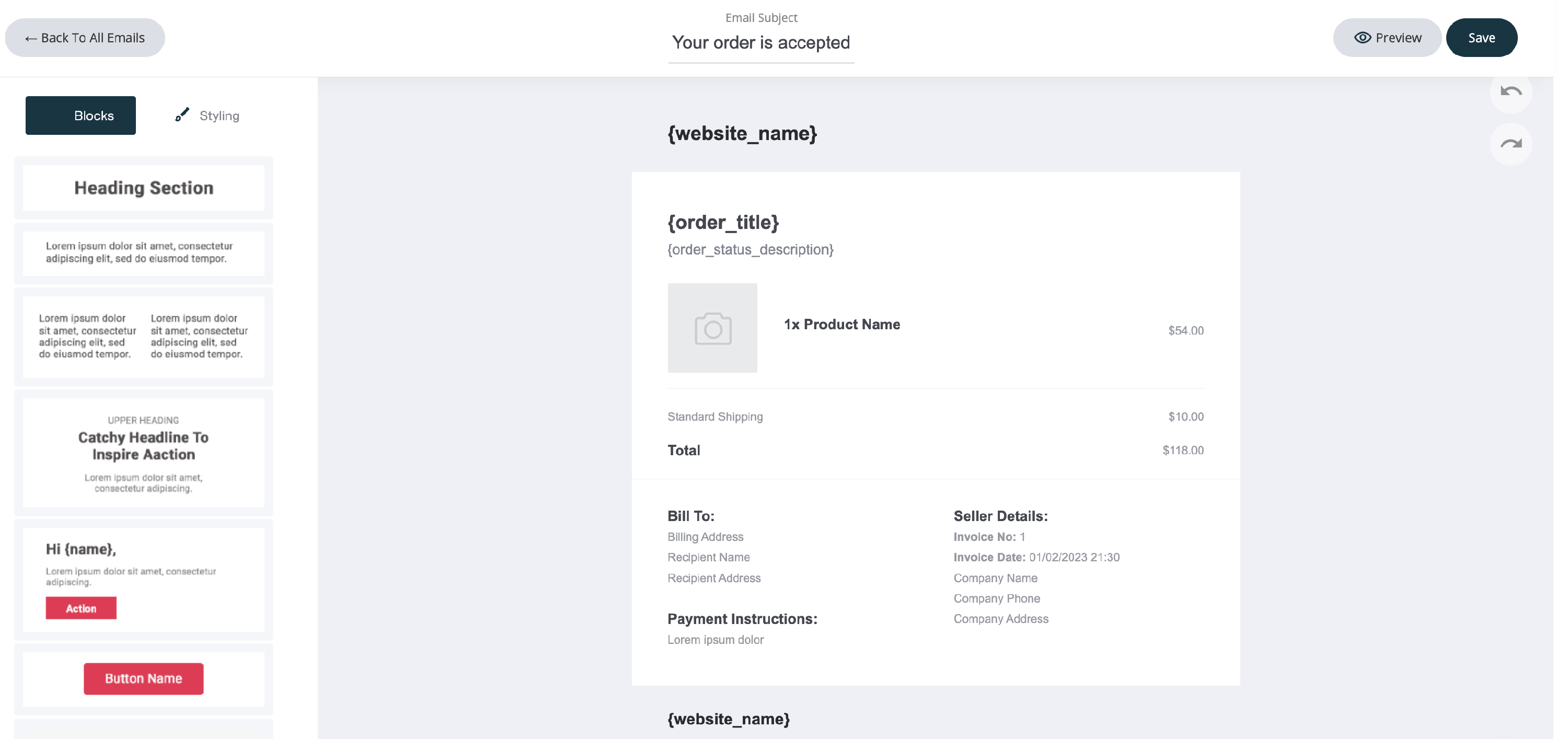 Just like any other email, you can edit the template with the drag and drop email editor. Below is the new order system email. We have already added the system fields such as website name and specific fields that are allocated to this email. All of which can be edited or deleted.