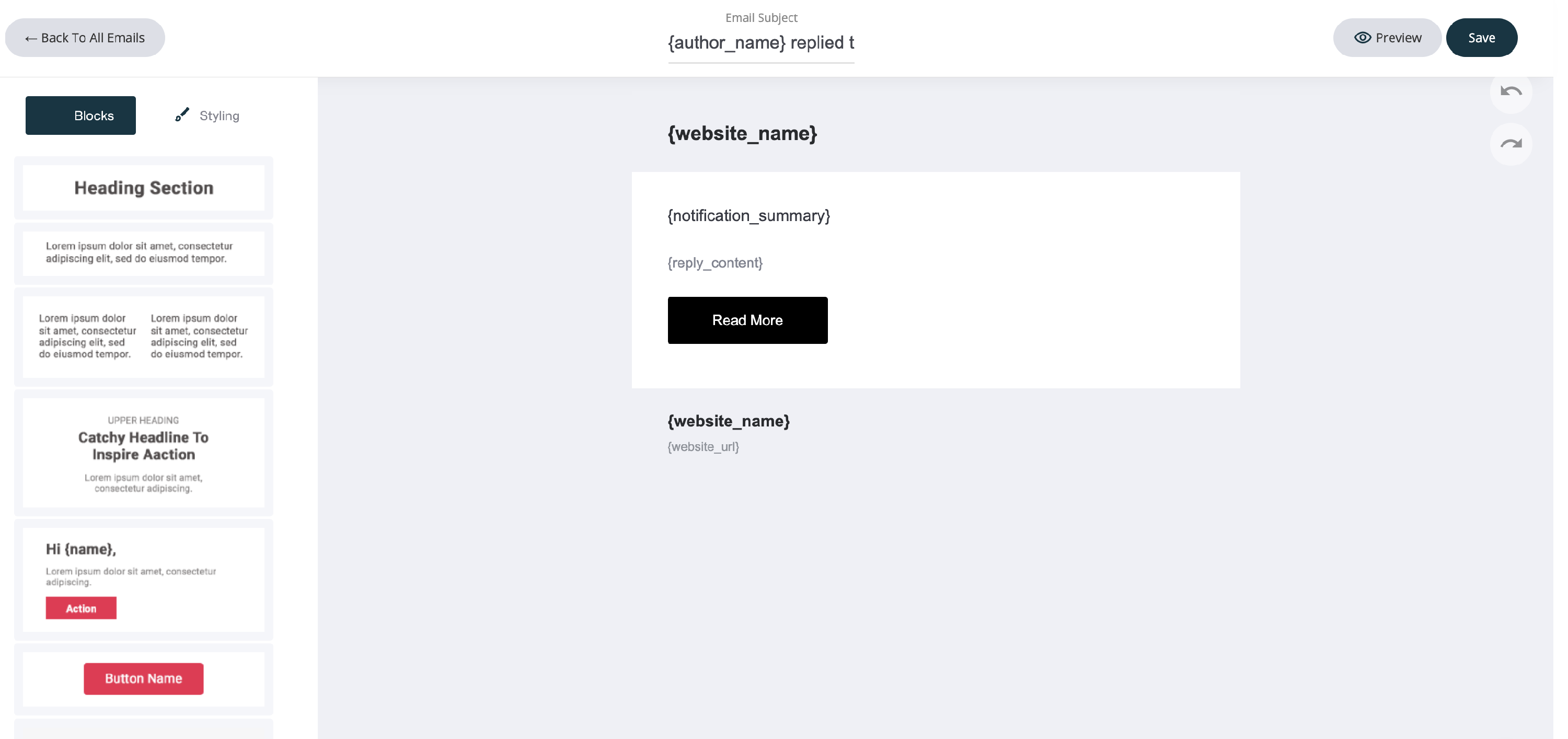 Just like any other email, you can edit the template with the drag and drop email editor. Below is the Replied to you community system email. We have already added the system fields such as website name and specific fields that are allocated to this email. All of which can be edited or deleted.