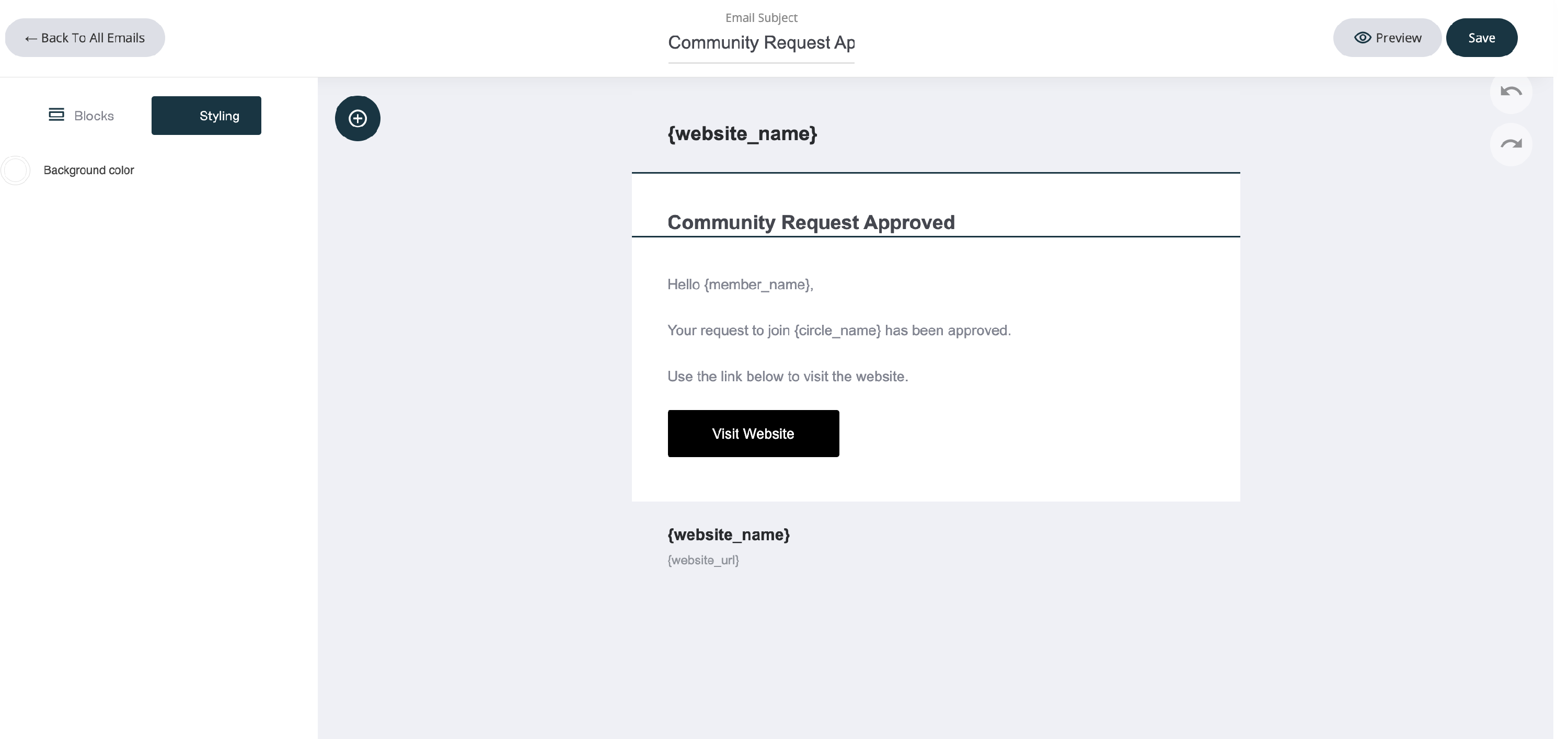 Just like any other email, you can edit the template with the drag and drop email editor. Below is the community request approved system email. We have already added the system fields such as website name and specific fields that are allocated to this email. All of which can be edited or deleted.