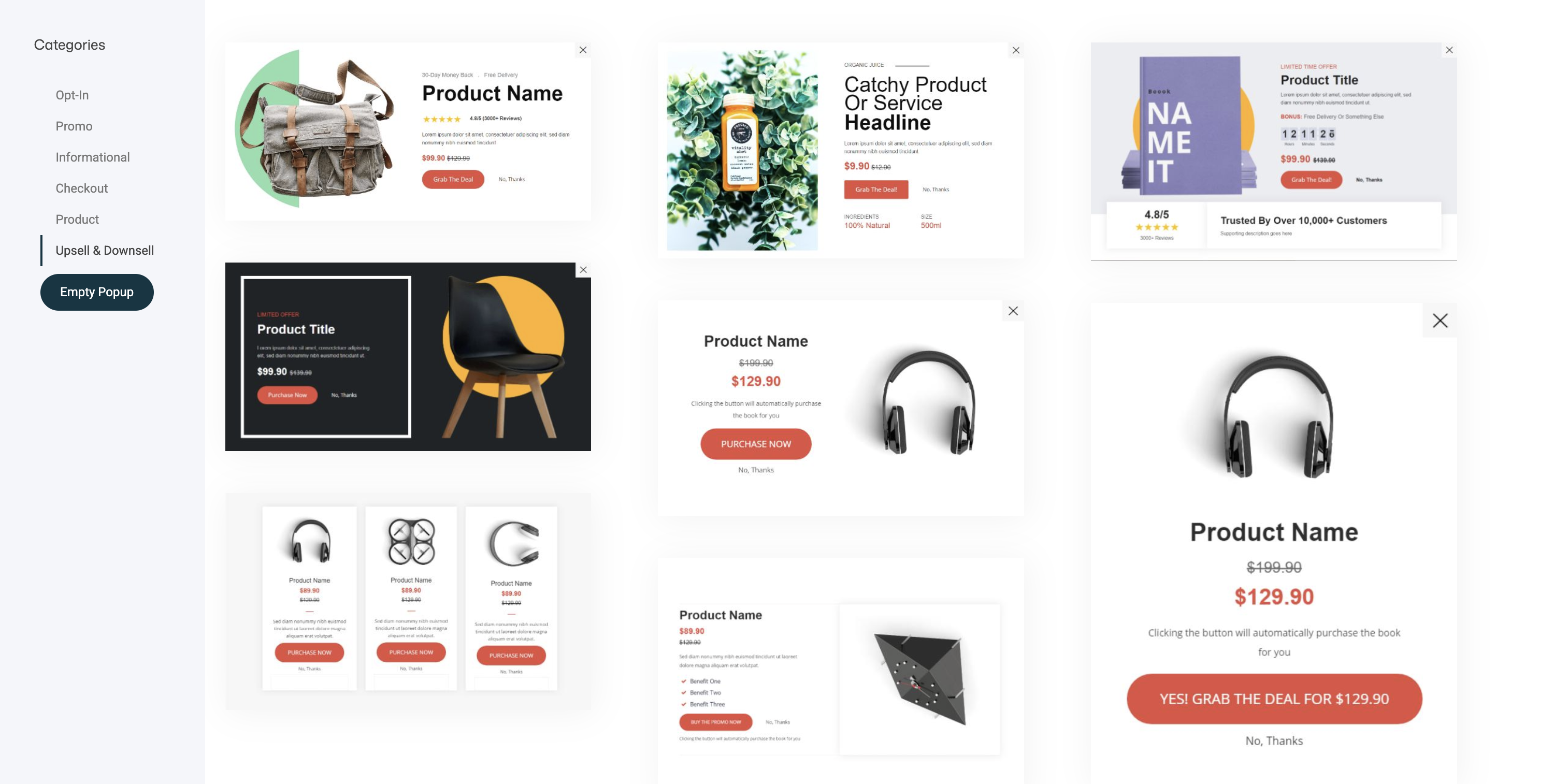 When you select Page or Popup, you’ll be presented with a set of pre-made upsell and downsell templates. These templates already include all required elements to make the upsell or downsell function correctly.