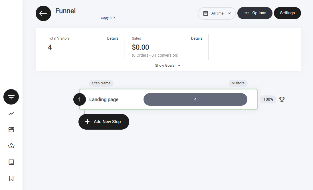 To the right of the funnel step you will see a trophy icon. This denotes a funnel step goal. For example, Once the visitor has taken action on the landing page. They have hit a goal. You can see all goals within the funnel analytics tab.