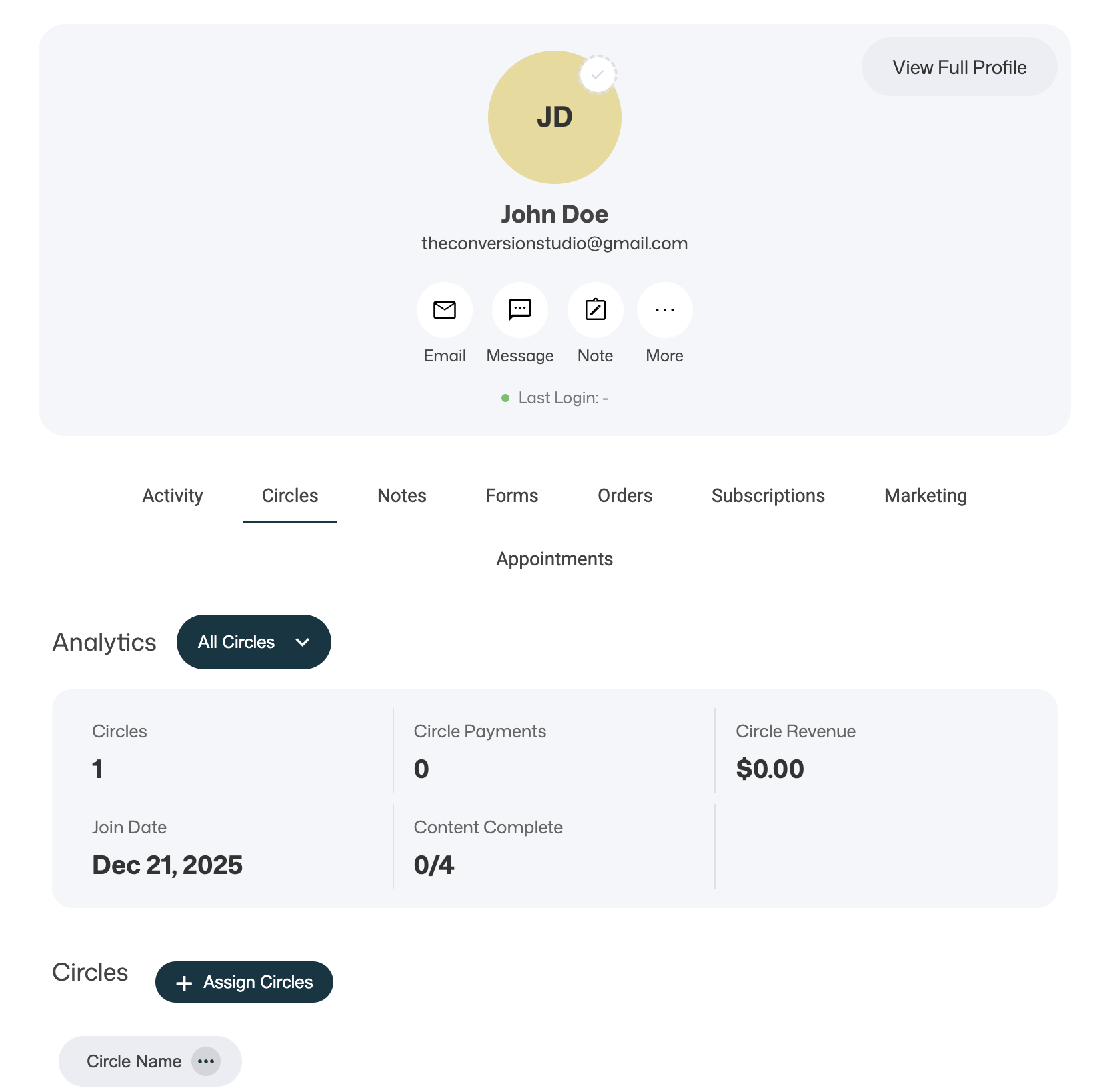 Together, these sections give you a full picture of each member — who they are, how they engage, what they’ve completed, and how they’re connected to your Circles and offers. As you go through each section below, you’ll learn how to use the Member Profile to monitor progress, manage access, communicate effectively, and support members throughout their journey.