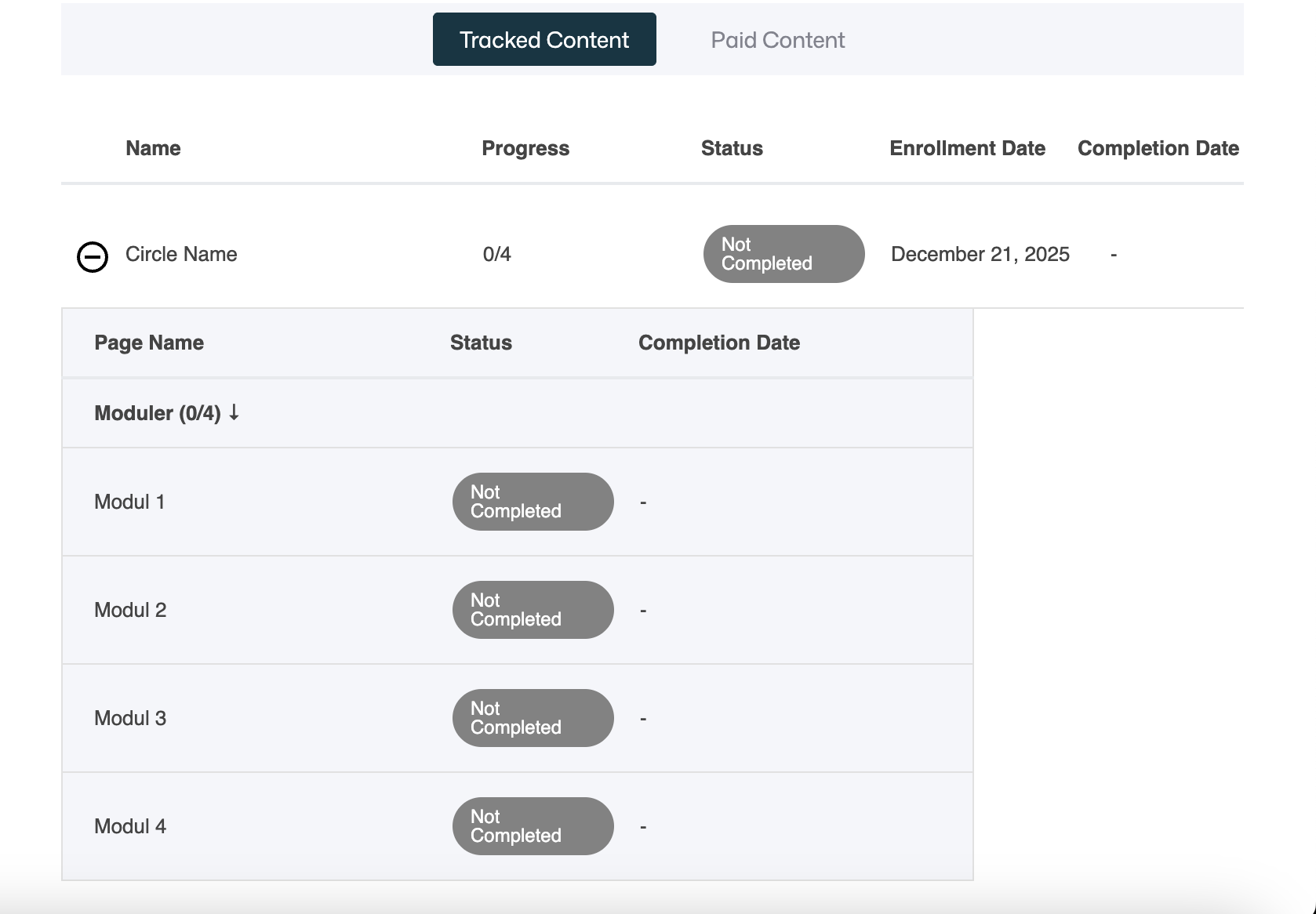 The Tracked Content view shows detailed learning progress for structured content such as courses or programs inside a Circle.