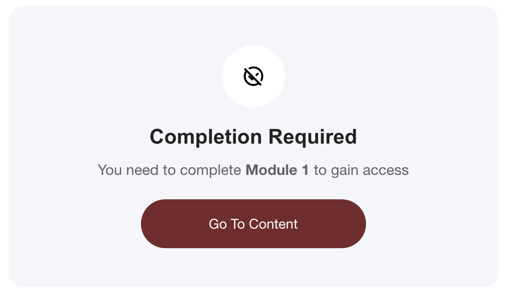 Members cannot access Video 2 until they actively complete Video 1. If a member tries to access the page before they have completed the specified content, they’ll see a locked state prompting them to complete the specified content to gain access with a CTA to go to the specified content.