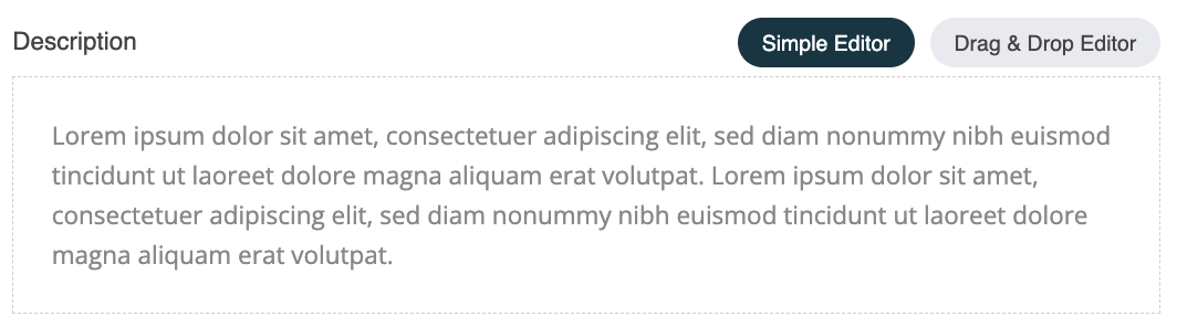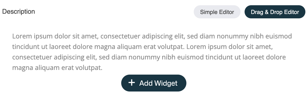 Drag & Drop Editor – opens the web studio controls so you can add any widget – this enables richer layouts with sections, images, and formatting. Simply click the Add Widget button to open the widget panel to the left and drag and drop any widget to the discription field.