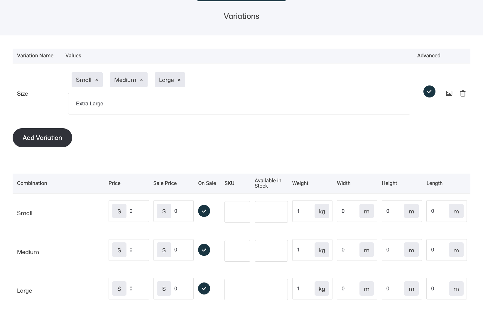Variations let you create multiple versions of the same product, such as different sizes, colors, materials, or bundles – without creating separate products.