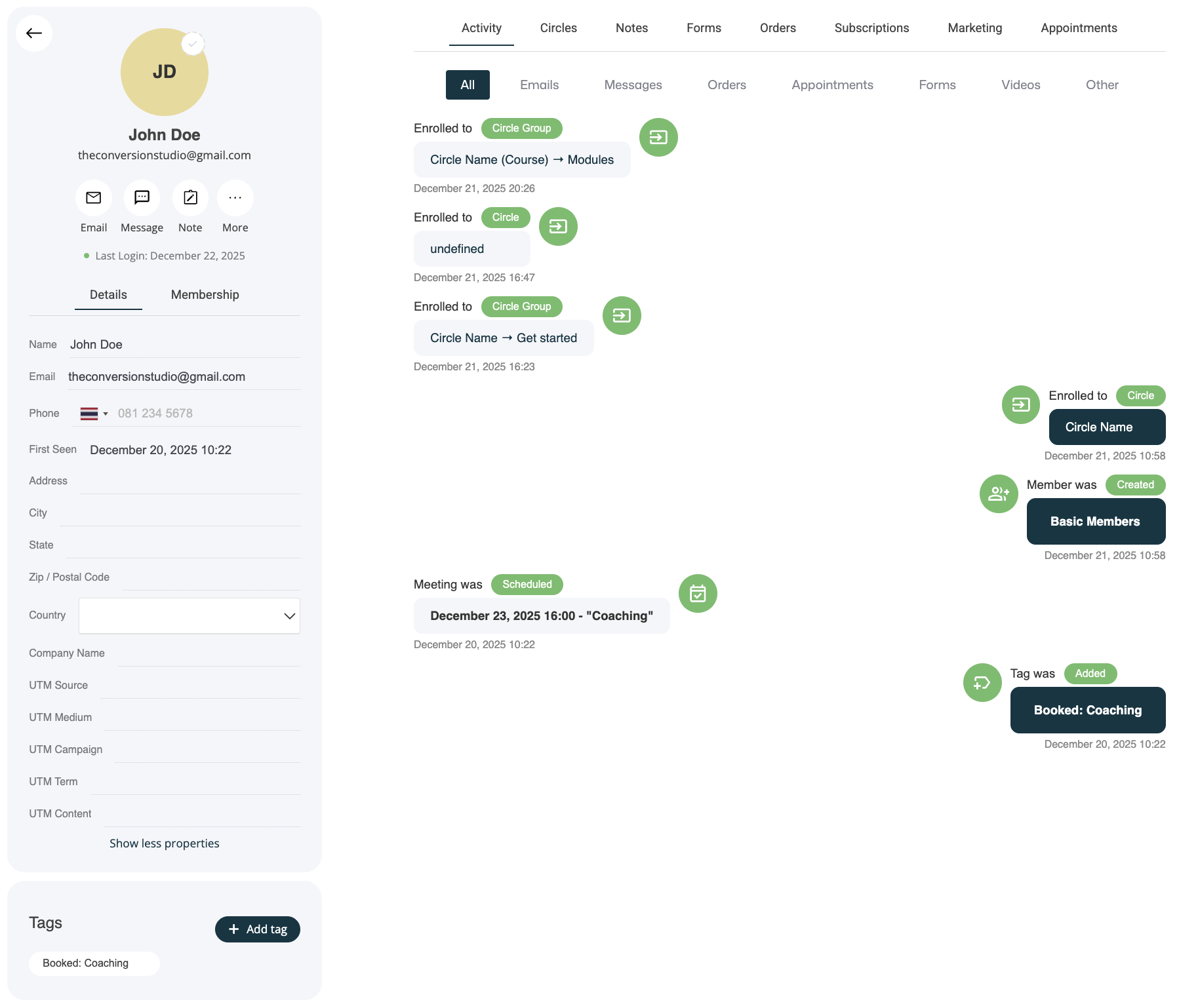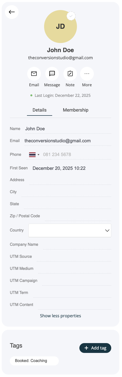This profile acts as the single source of truth for everything related to a contact — whether they are a lead, customer, or registered member.