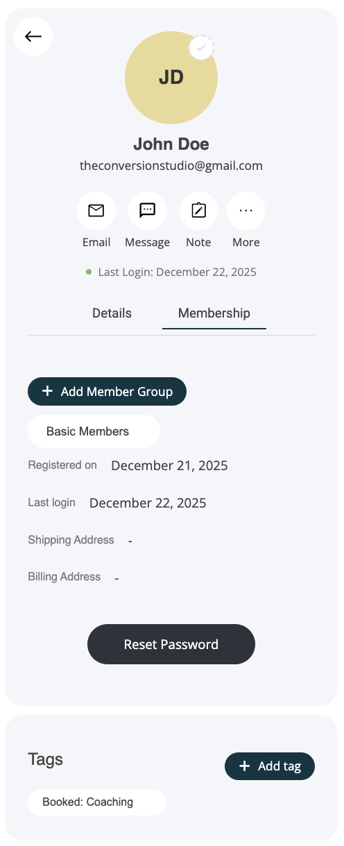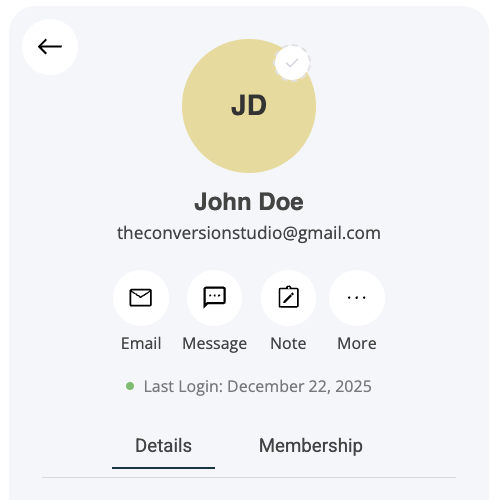 The Contact Profile gives you a complete, centralized view of an individual contact or member in your platform. From here, you can review personal details, track activity, understand engagement, manage memberships, and take direct actions such as messaging, tagging, or access control.