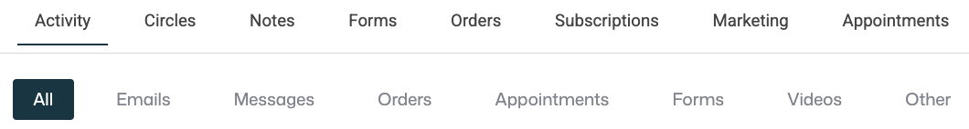 You can filter the timeline by activity type (such as emails, orders, forms, or appointments).