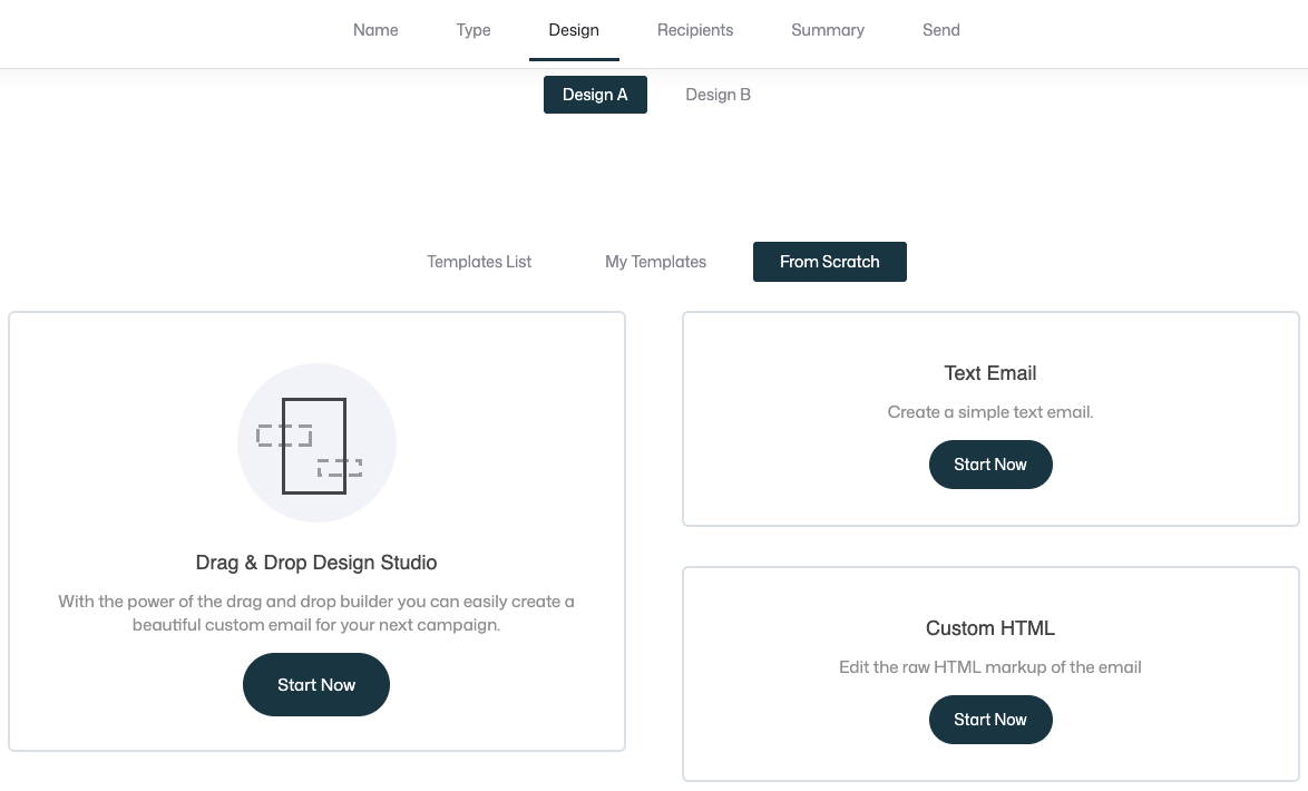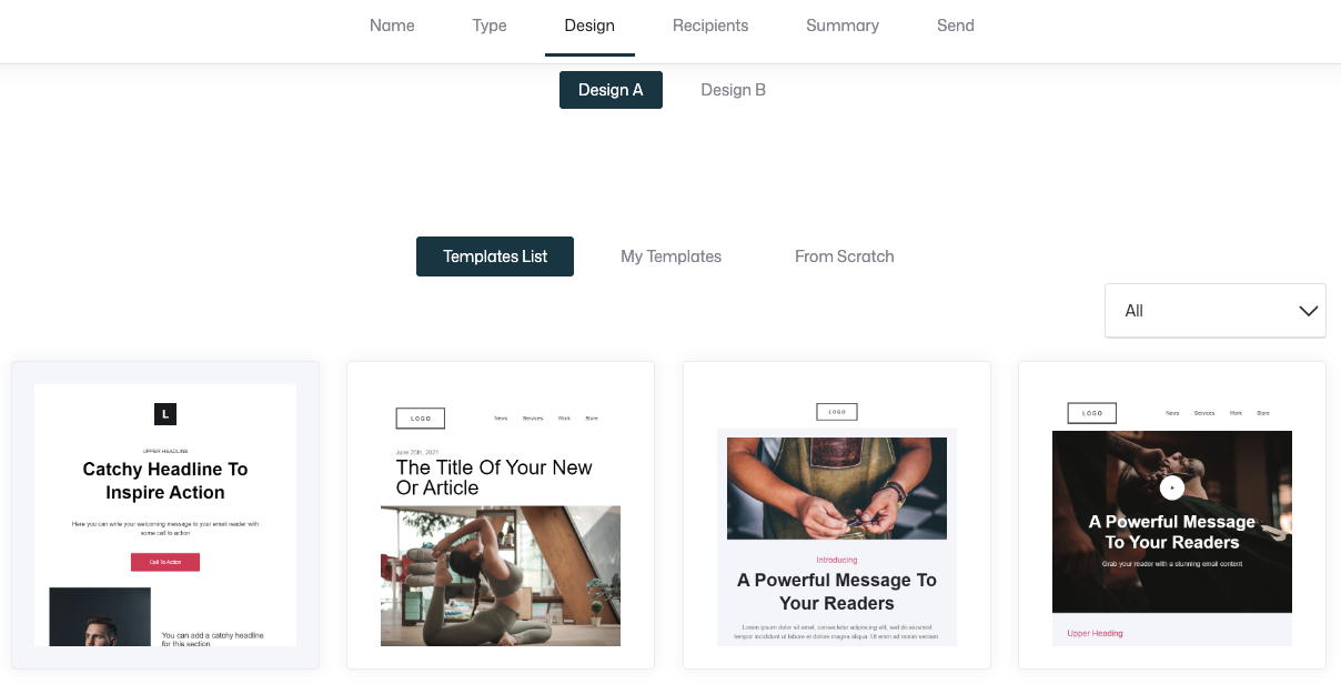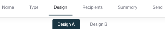 If you selected an A/B Split Campaign, you’ll design both versions at this step, simply switch between the two versions at the top.
