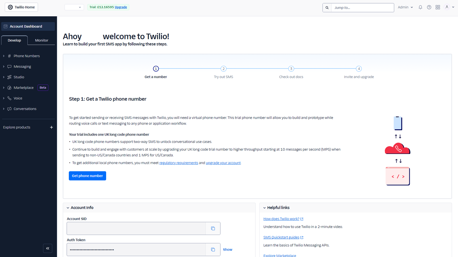 Once registered, you’ll be taken to the Twilio main dashboard.