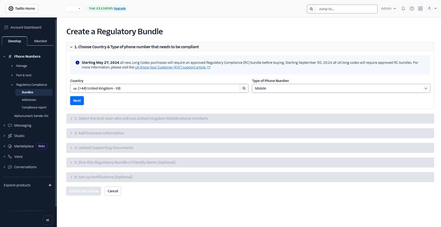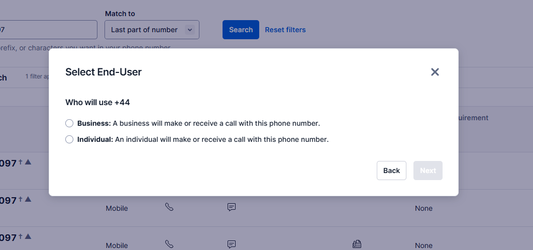 During number purchase, Twilio may guide you through compliance steps such as selecting end-user type (Business or Individual) and assigning a regulatory bundle. This is normal and required in many countries.