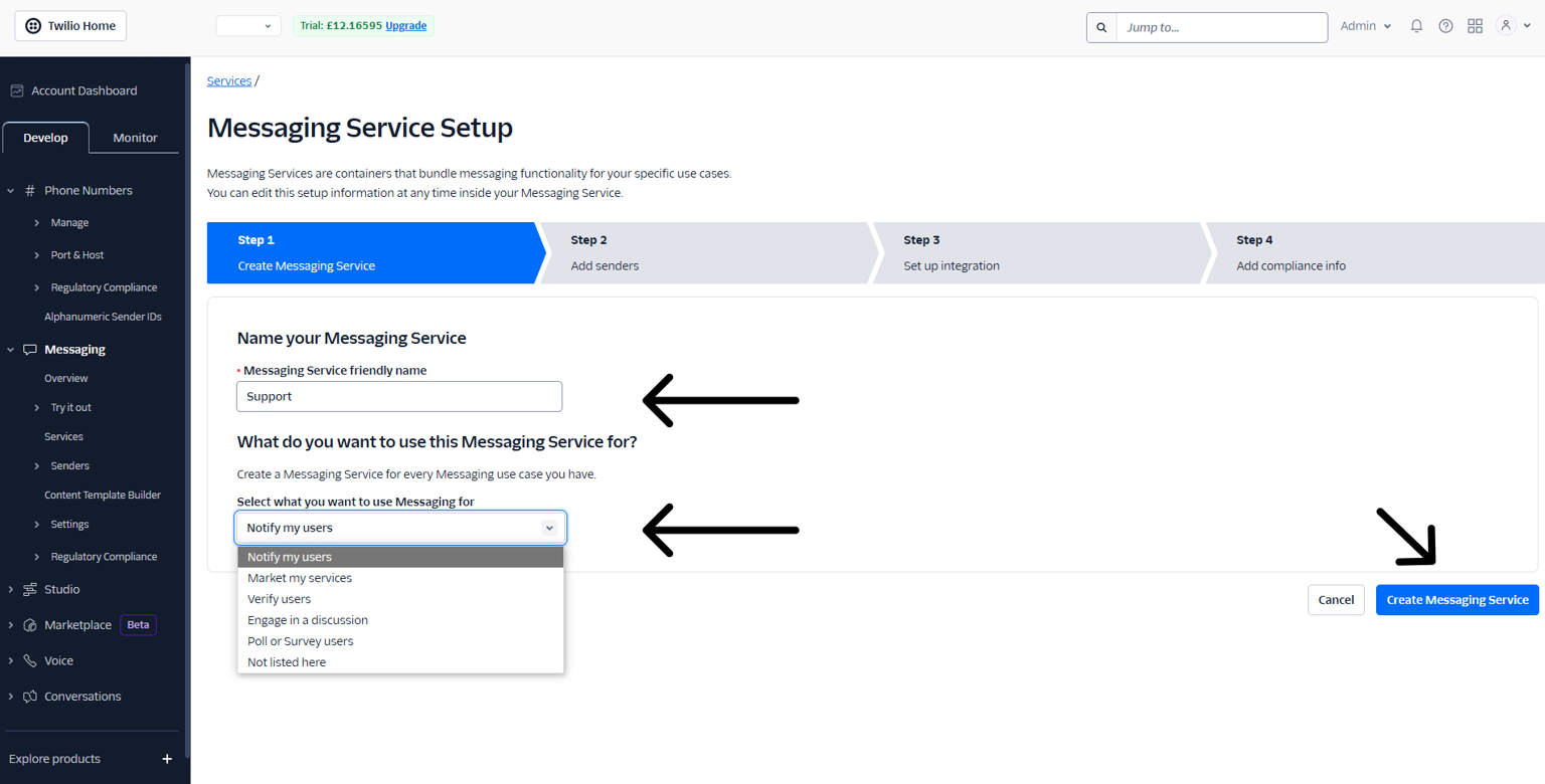 Step 4: Create a Messaging Service (required for SMS & WhatsApp)