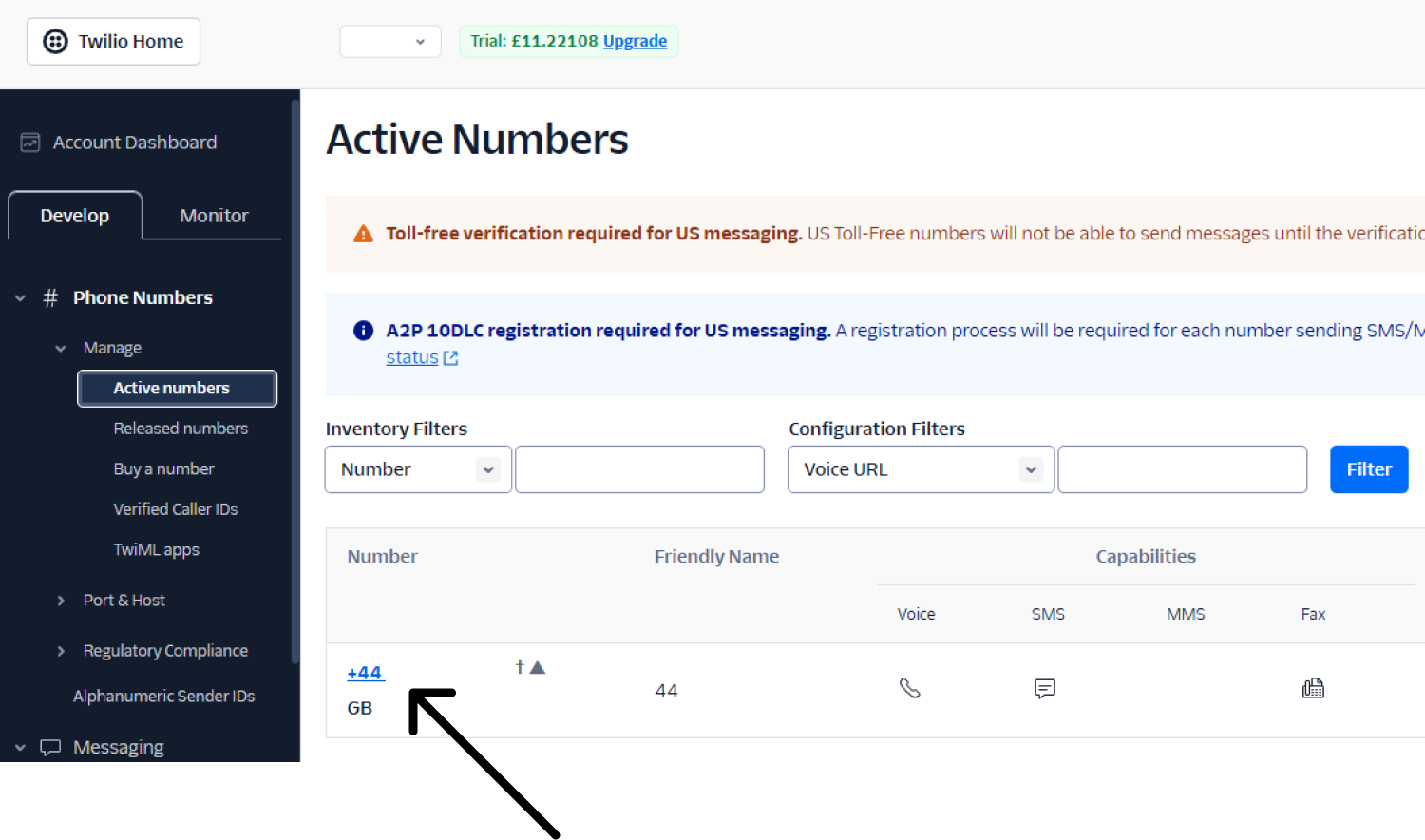 - Go to Twilio Dashboard → Phone Numbers → Manage → Active numbers