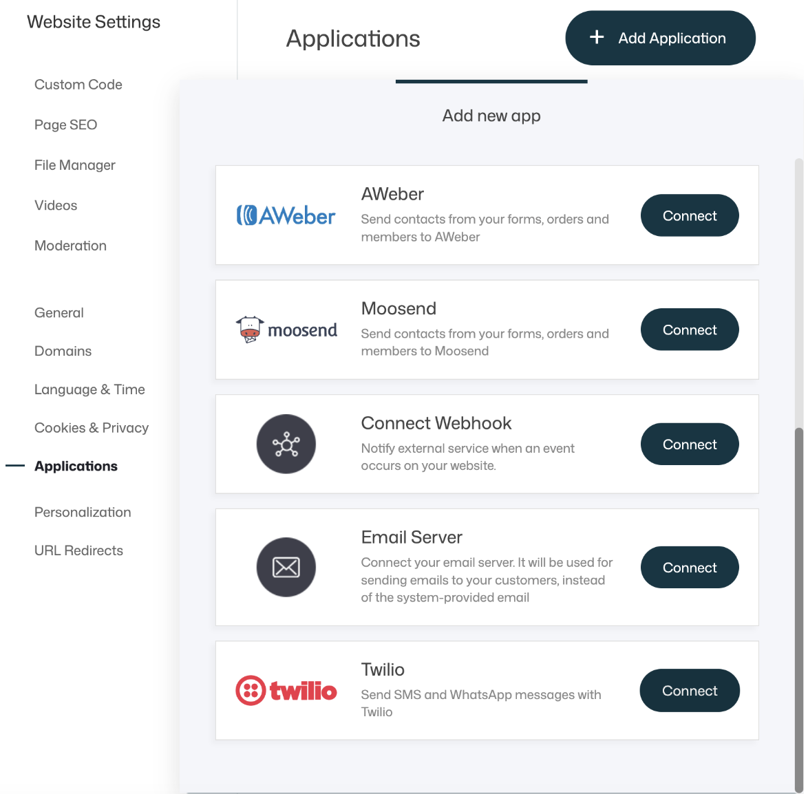 - In Recrevio, navigate to Web Studio > Website Settings > Applications > Add Application