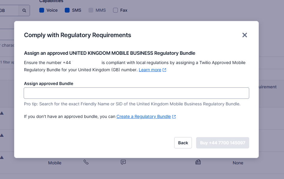 For some countries and number types, Twilio requires an approved Regulatory Bundle.