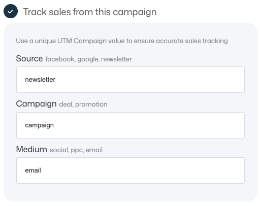 These values are used to generate UTM tracking links and connect email clicks to sales data.
