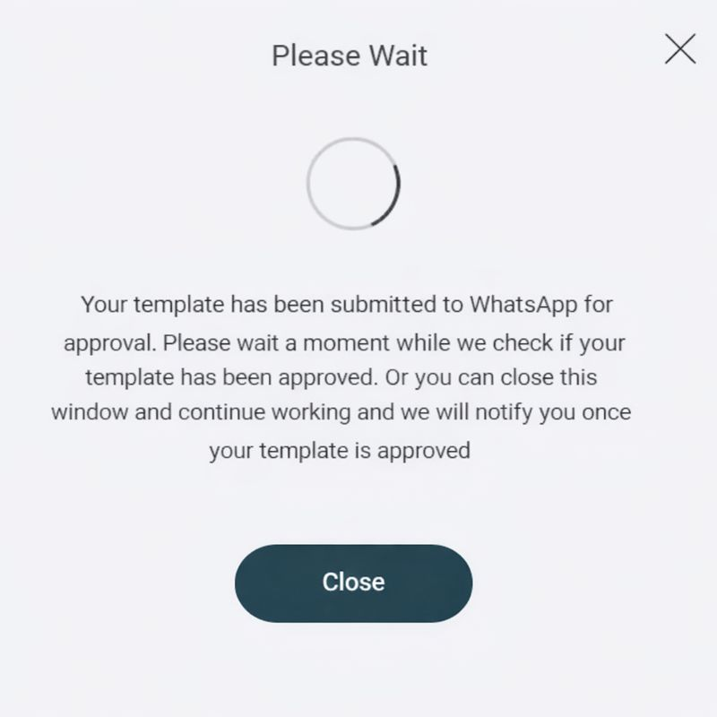 After submission, you may see a “Please wait” status window. Approval is often quick, but can sometimes take longer depending on WhatsApp.