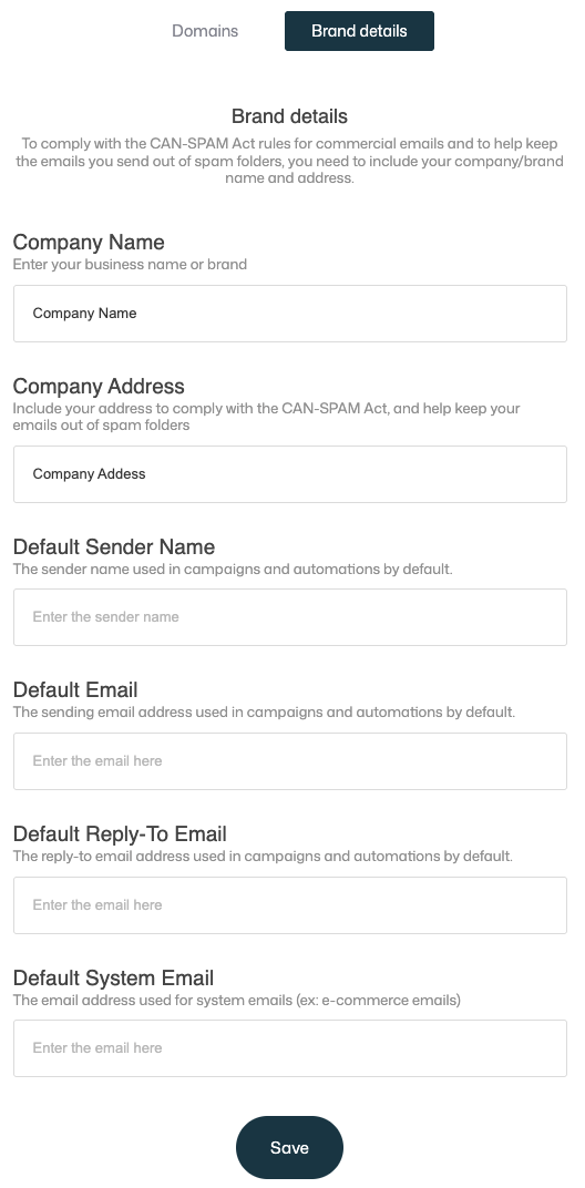 After your domain is verified, you must fill in Brand details before you start sending campaigns.
