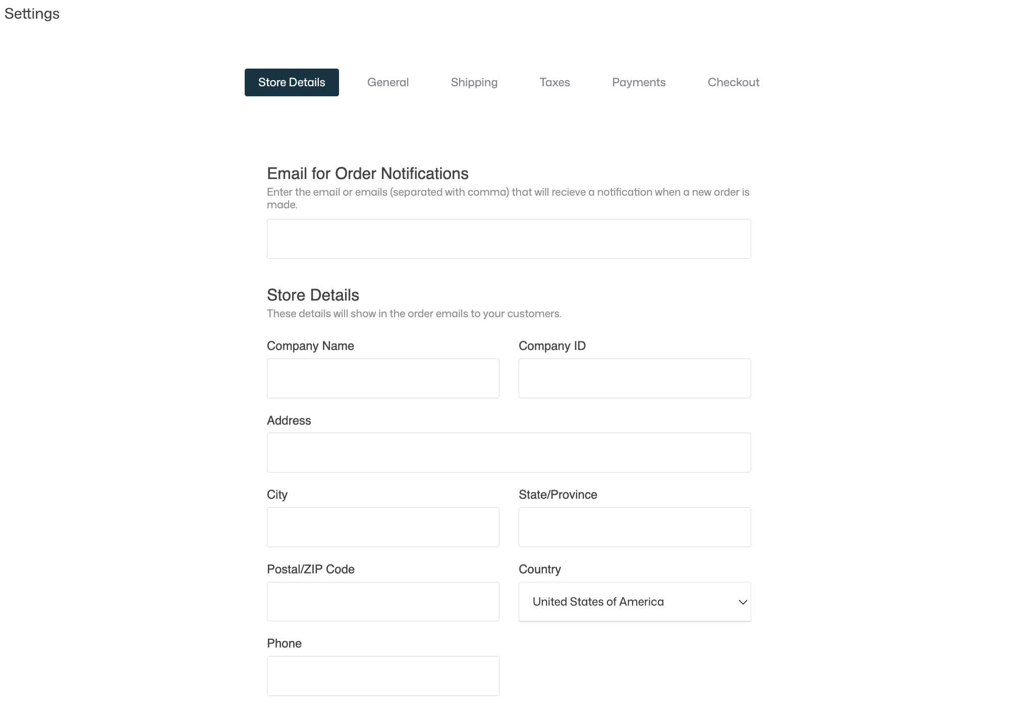 To configure your store in detail, continue with the individual articles for each tab, starting with Store Details, and then moving through General Store Settings, Shipping, Taxes, Payments, and Checkout.