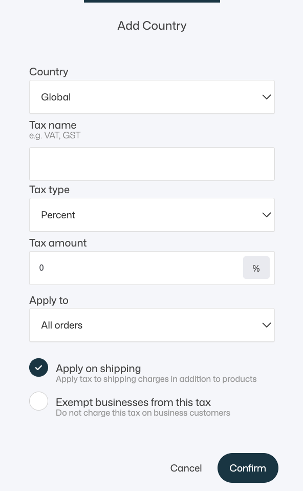 - Configure country-specific tax rules for every country you sell to