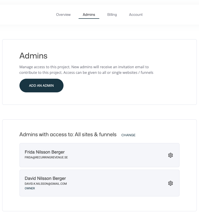 - Control what each admin has access to – either all websites & funnels or selected ones