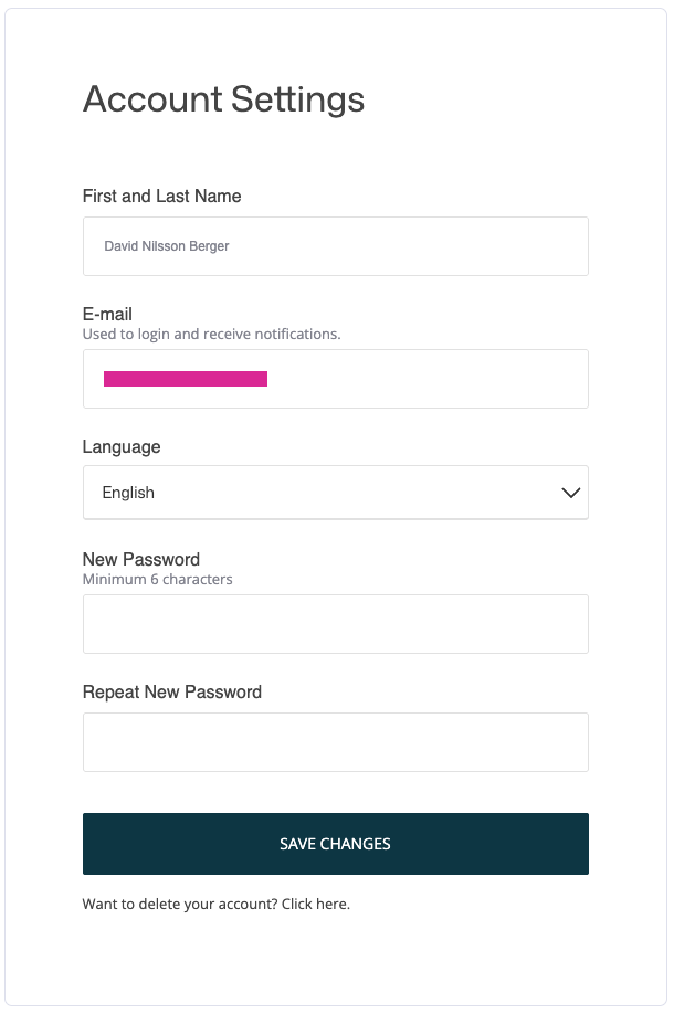 The Account Settings section lets you manage your personal account details used across the platform. From here, you can update your name, email address, password, interface language, or permanently delete your account.