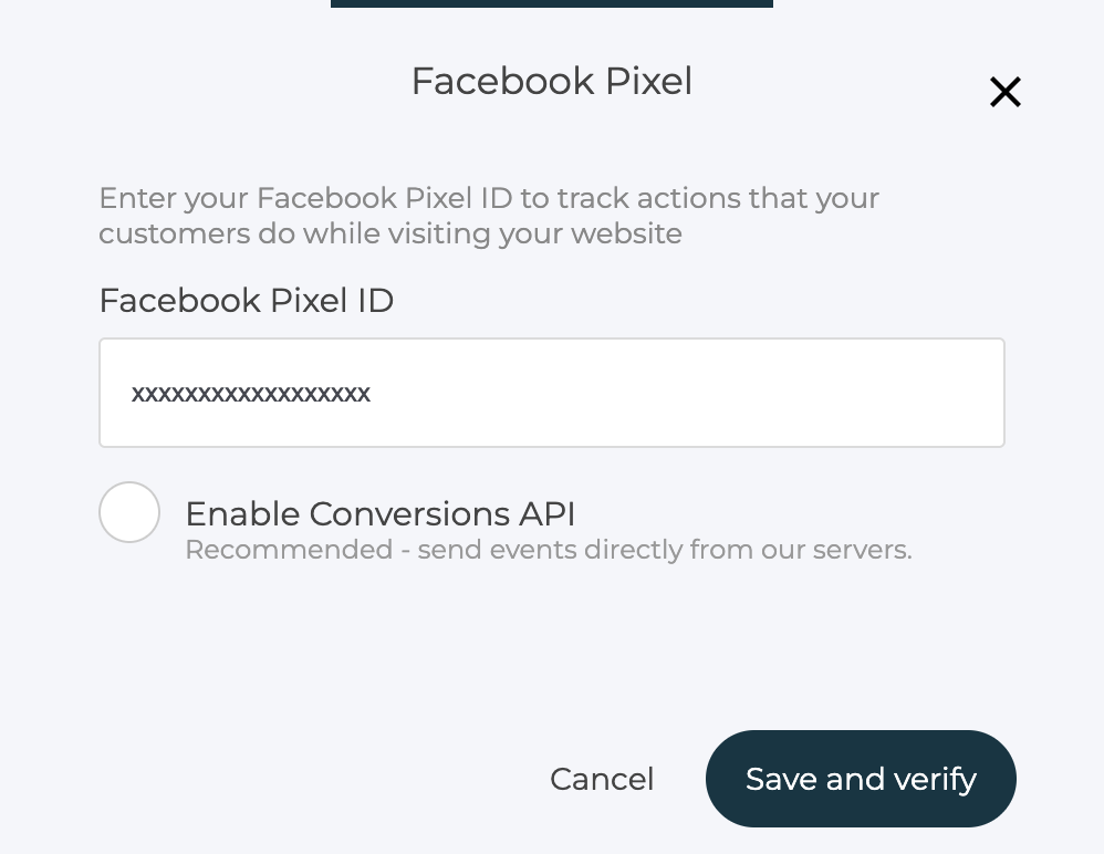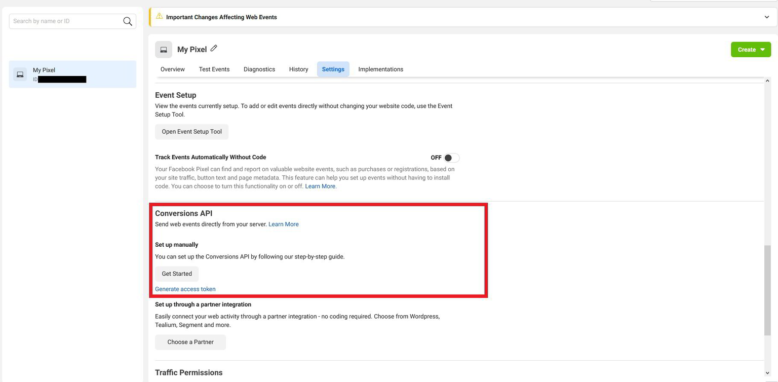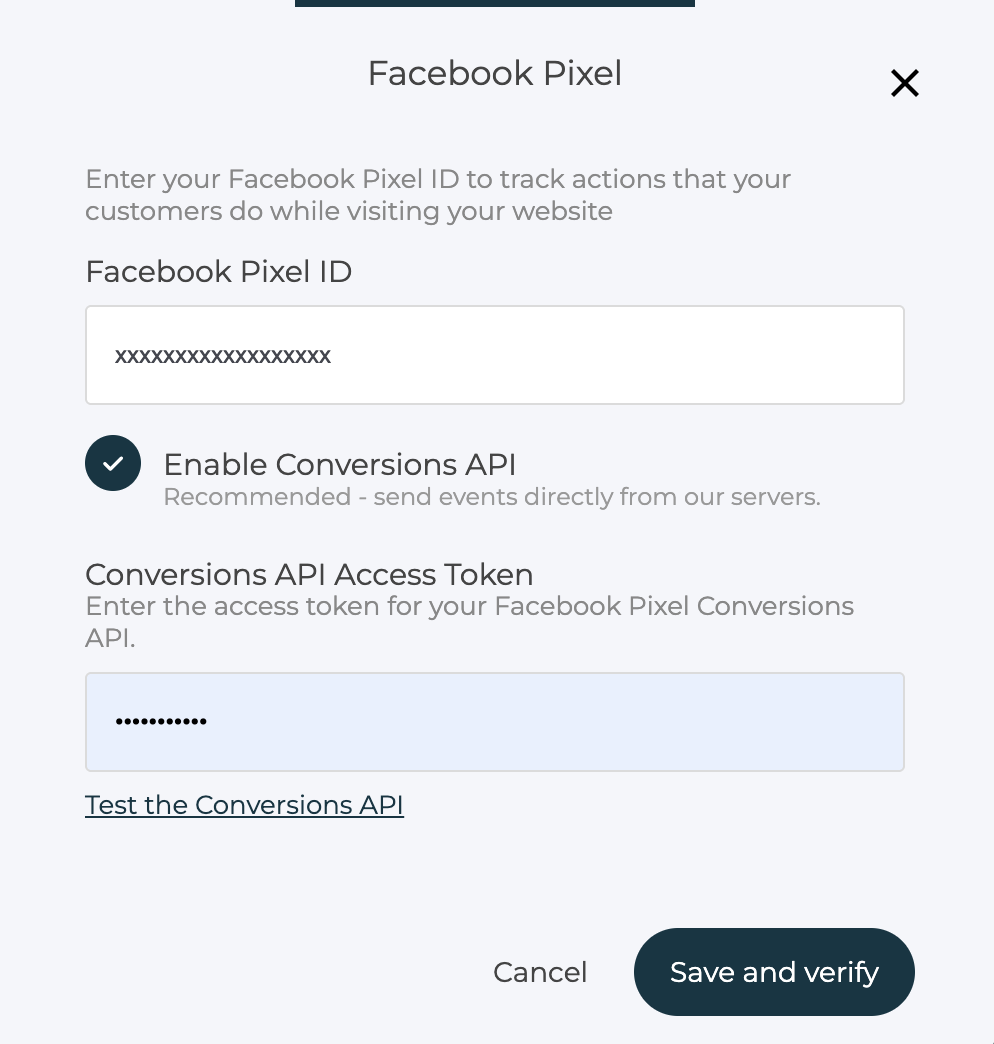 To enable CAPI, you’ll need an Access Token from your Facebook Pixel.