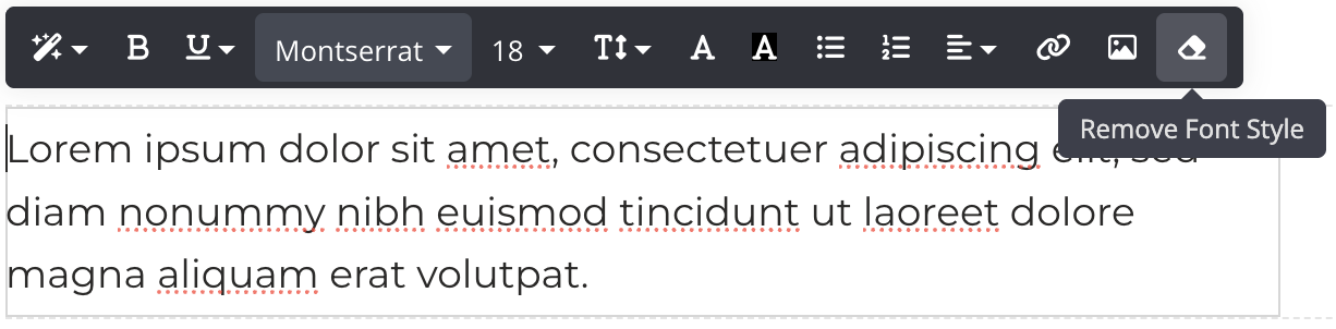 - Some text isn’t updating: It may have custom inline styles applied. Reset the element to its default (e.g., switch it back to H2) to inherit global settings. If that doesn't work you can Remove Font Style by clicking the far right icon in the text edit panel: