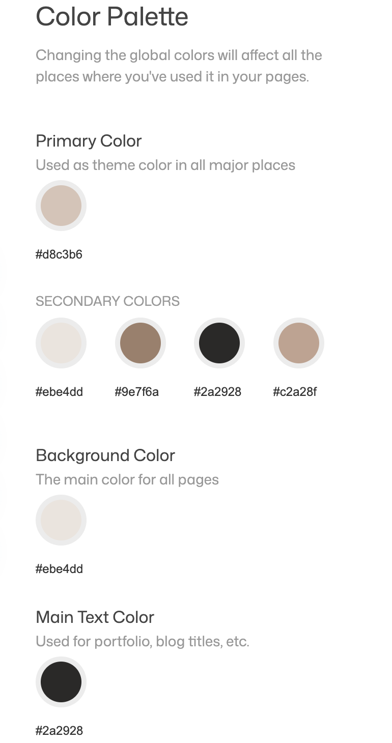 In Web Studio > Global Styling > Color Palette, you define the main colors used throughout your site. These settings affect everything from text and buttons to backgrounds and accents. Once set, your color palette ensures a consistent, branded look across all pages.