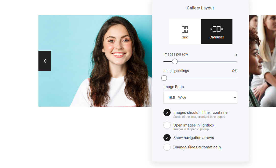 There are two main styling options to chose from: Grid and Carousel. A grid layout will display a static format of all the images you add. Carousel enables you to add movement to your images or manual user input to scroll though such images.