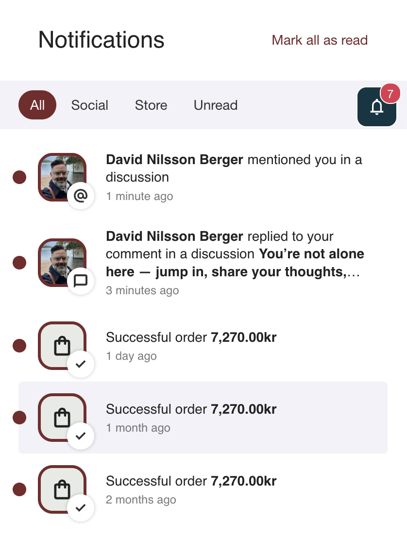 - Social → notifications related to community activity and interactions.