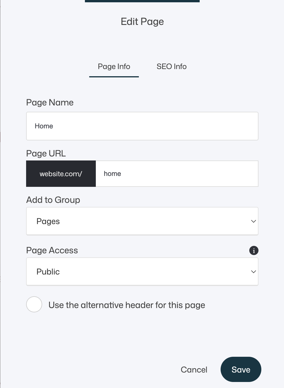 The Edit Page settings give you full control over how each page on your website behaves, who can access it, and how it appears in search engines and on social media.