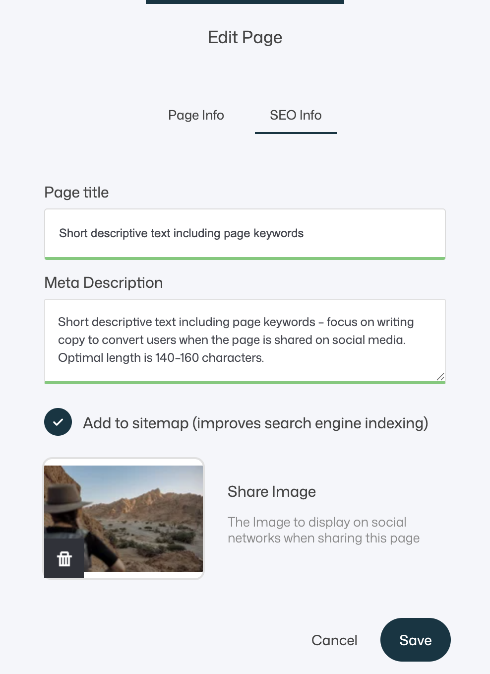 The SEO Info tab controls how your page appears in search engines and when shared externally.