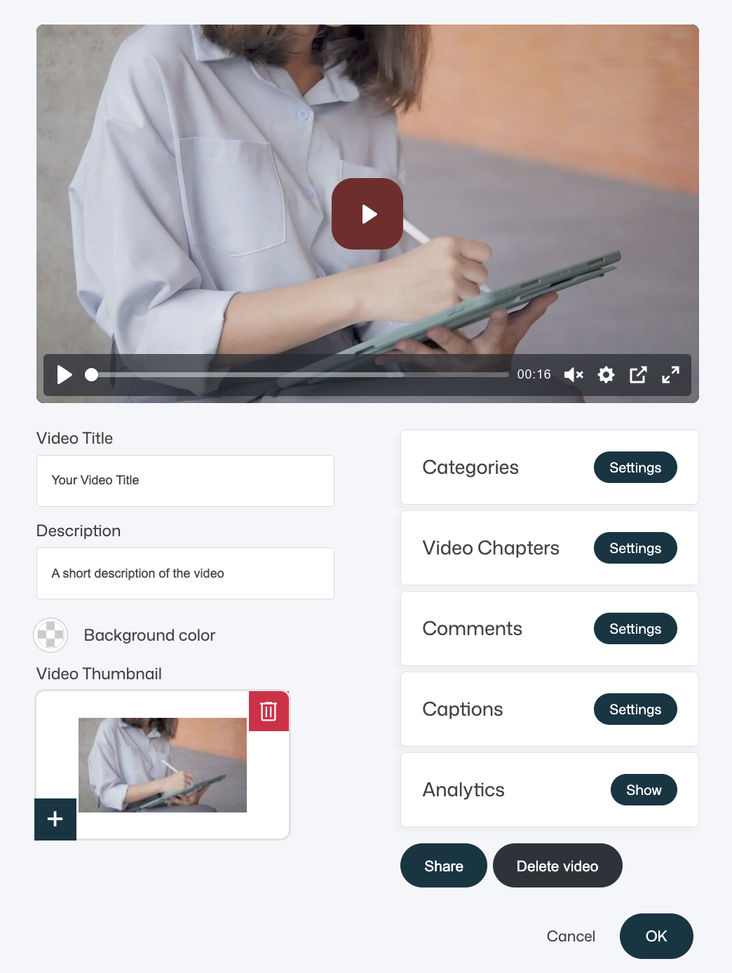 A video thumbnail is the preview image that represents your video before it’s played. You can upload a custom thumbnail to make the video more visually appealing and recognizable.