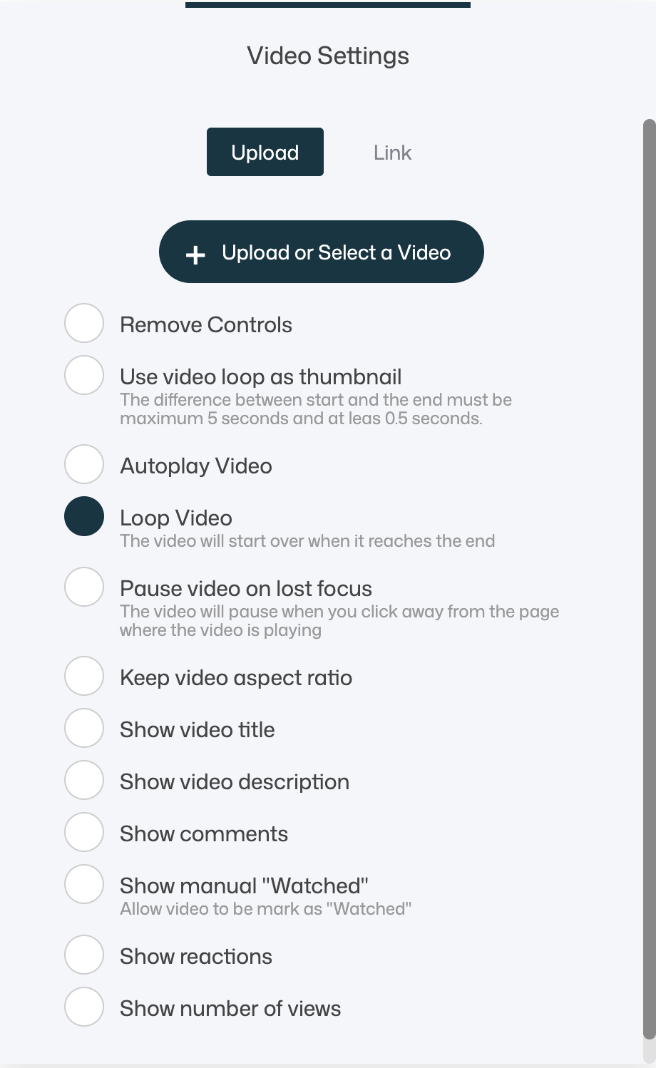 Once a hosted video is selected, you can fully control how the video behaves, looks, and how viewers interact with it. Each setting is optional and can be enabled or disabled depending on your use case.