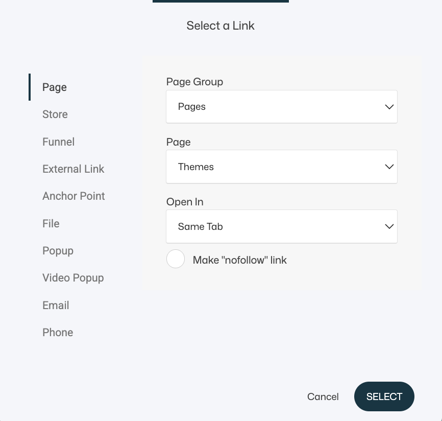 Links help you connect content, navigation, and actions across your website — from simple text links to popups, funnels, files, and click-to-call buttons. This article explains where you can add links, and how to use the link selector popup with all available link types and options.